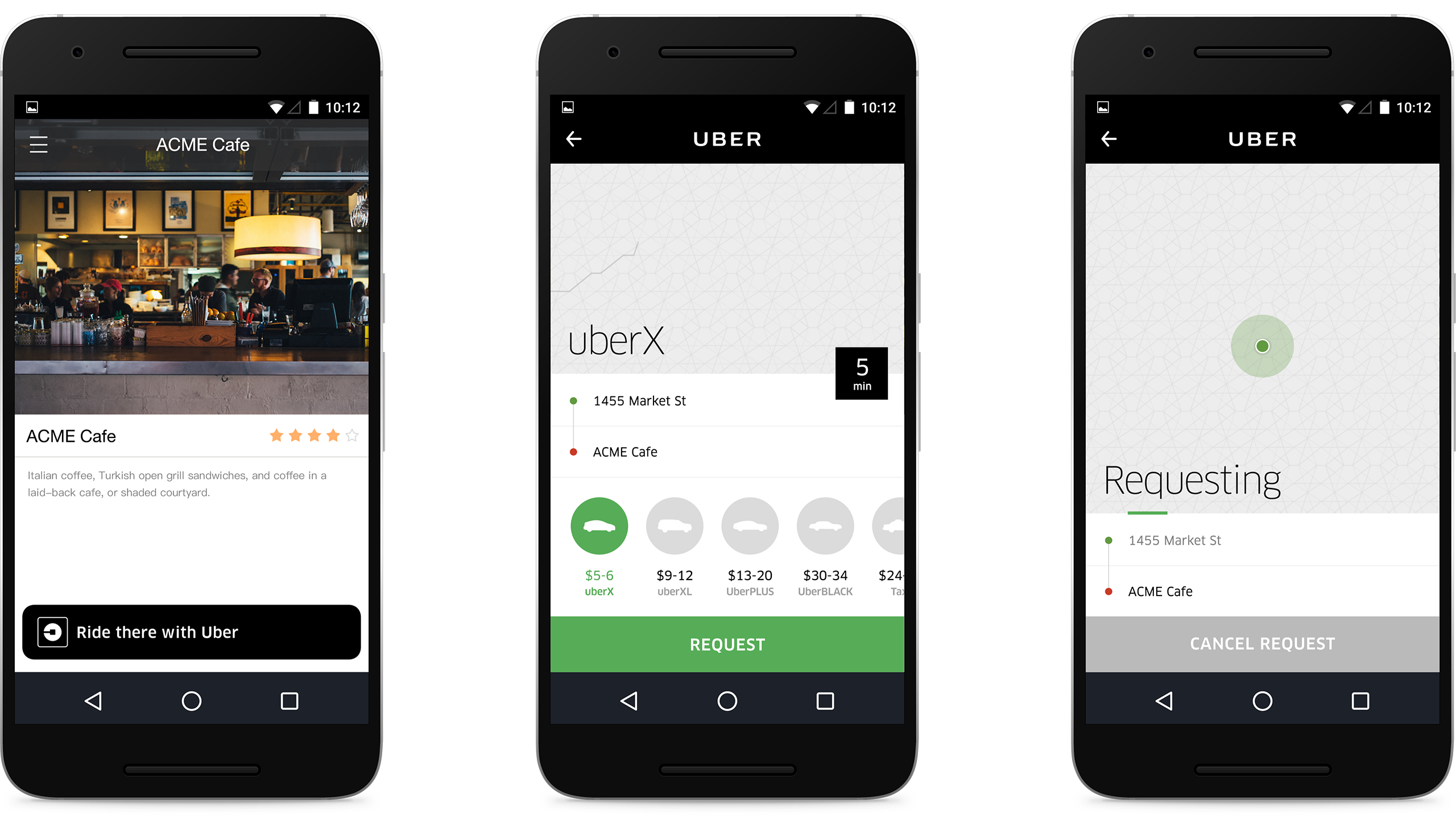 Get startedGive your users the entire Uber experience within your app — all with just a few lines of code. Available starting in mid-April.